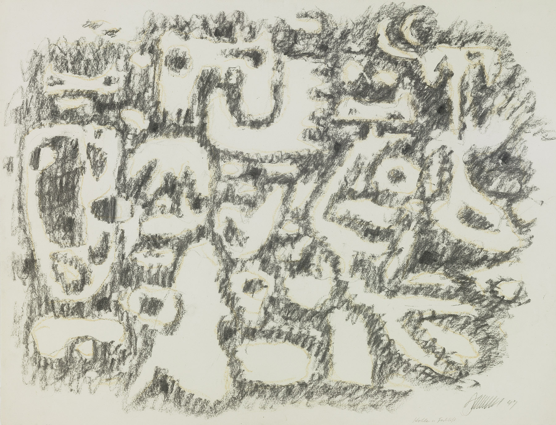Kohle, Pastell in Ockergelb, fixiert, auf chamoisfarbigem Bütten mit Wz. l. o.: P. M. FABRIANO (ITALY)