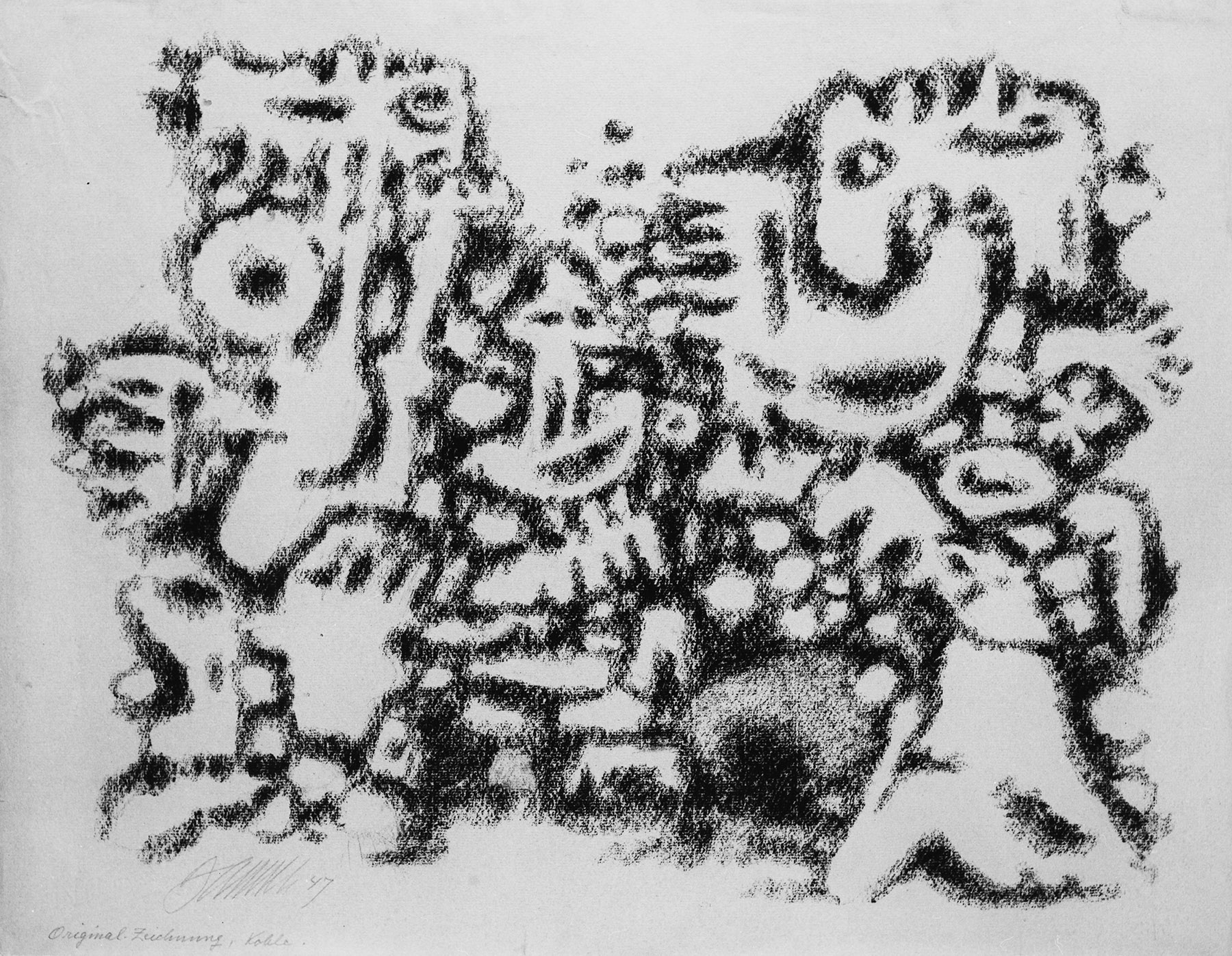 An den Rändern leicht verknickt. am Rand l. drei kleine Risse. z. T. von rückwärts verschlossen. ein ca. 20 mm langer Riß im Rand u. Mitte. ein kleiner r. davon. leichte Bräunung des Papiers durch Fixativ.