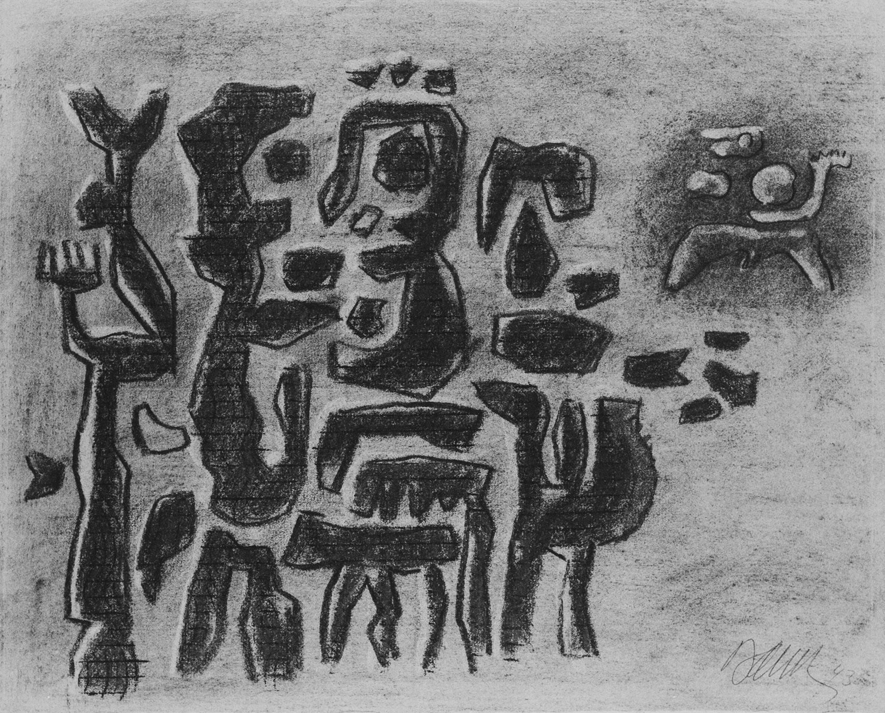 Kohle, gewischt, radiert, Bleistift, Ölkreide in Schwarz, durchgerieben, Rot, Blau, Pastell in Gelb, Ocker, fixiert, auf rosafarbigem Ingres-Bütten mit Wz. l. u.: INGRES