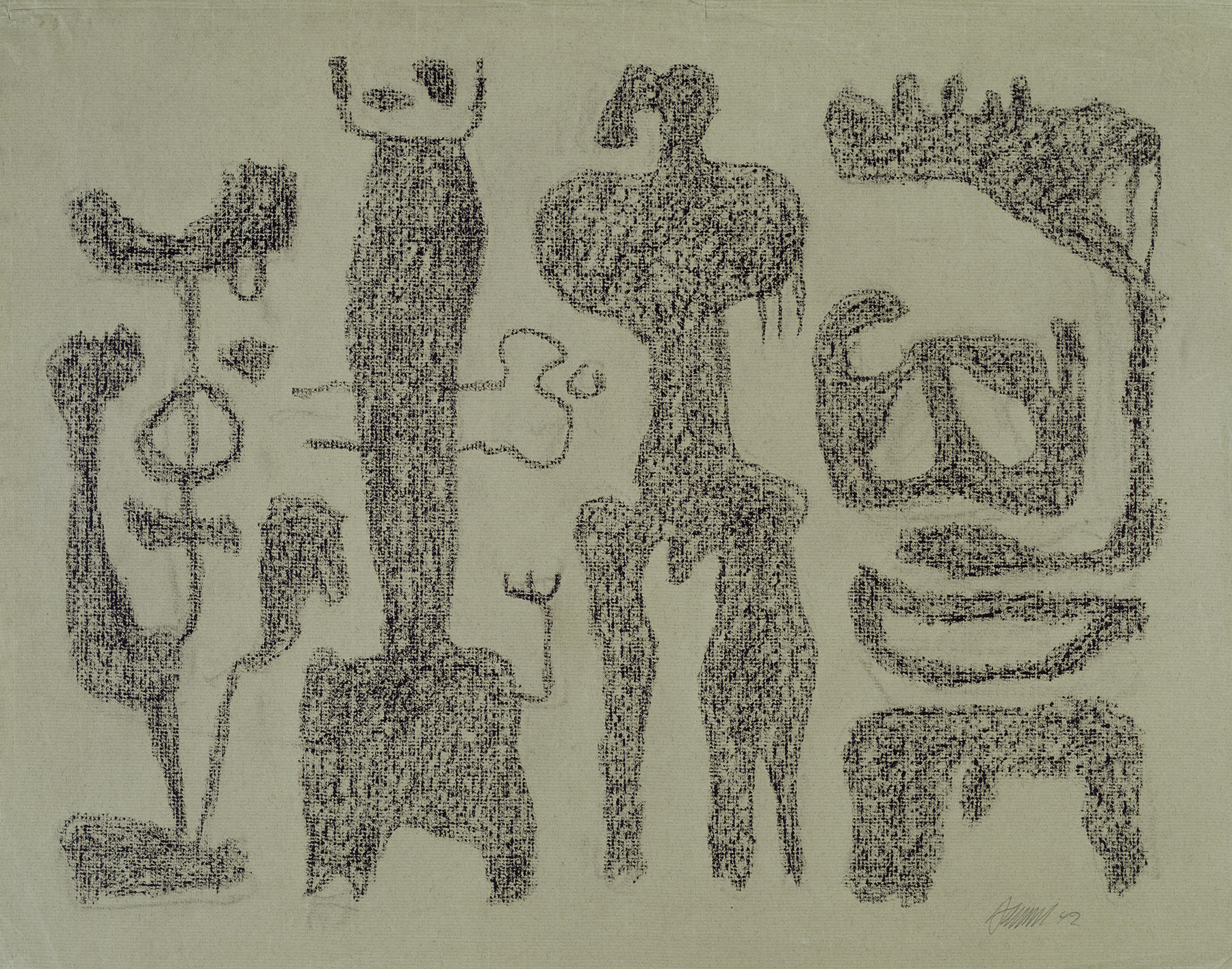 Kohle, Ölkreide in Schwarz, durchgerieben, fixiert, auf graugrünem Ingres-Bütten mit Wz. r. o.: Steigender Löwe im Kreis