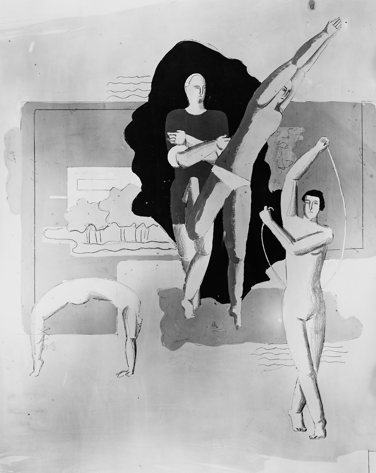 Bleistift, unter Verwendung des Lineals, Farbstift in Blau, Ölkreide in Rot, Deckfarbe in Weiß, Schwarzbraun, Rosa, Braun, Grau, Rot, auf chamoisfarbigem Zeichenkarton