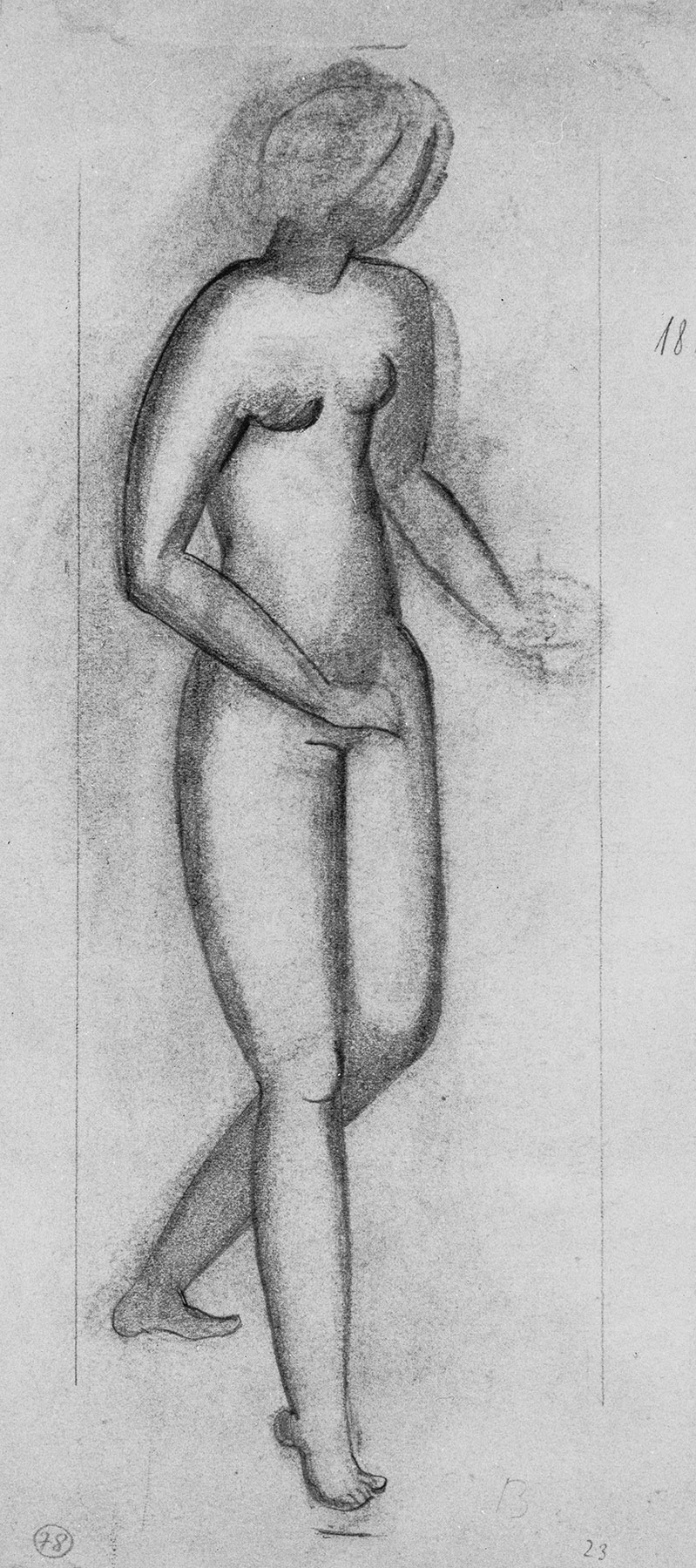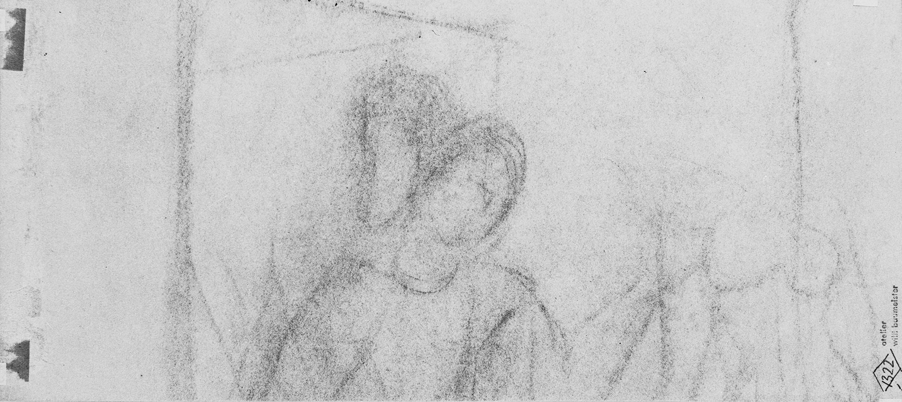 Kohle, z. T. gewischt, Bleistift, fixiert, Einfassungslinien r. und l., auf chamoisfarbigem Zeichenkarton