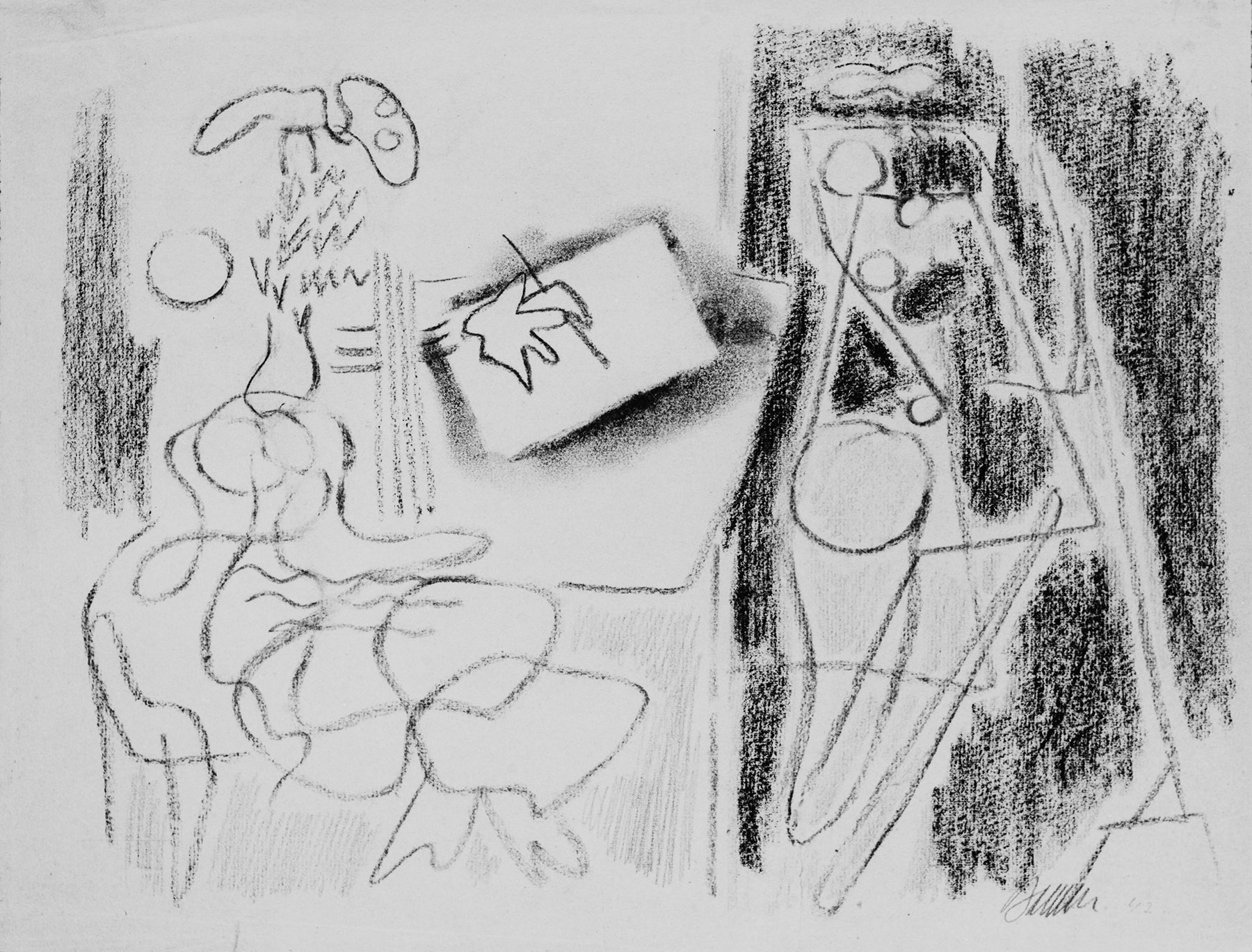 Kohle, z. T. gewischt, Ölkreide in Schwarz, Ockergelb, Bleistift, fixiert, auf lindgrünem Ingres-Bütten