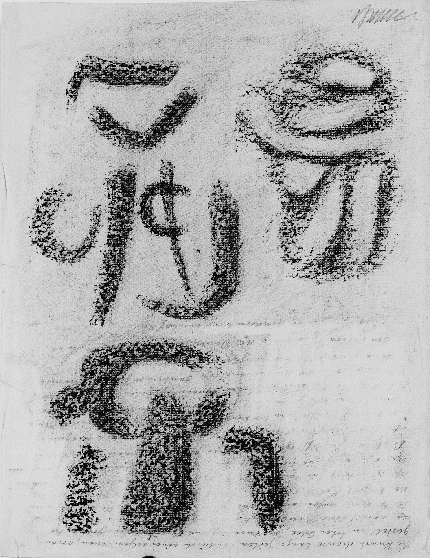 Kohle, gewischt, Ölkreide in Schwarz, Violett, Braun, Rot, Grün, Ocker, durchgerieben, auf chamoisfarbigem Ingres-Bütten
