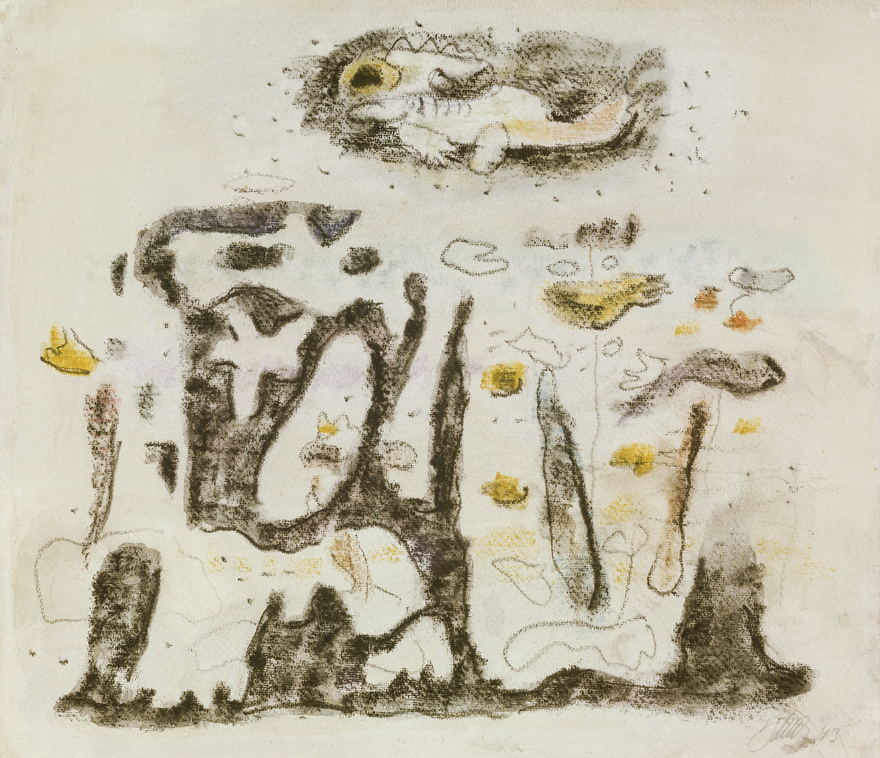 Kohle, farbige Kreiden, aquarelliert, auf elfenbeinfarbigem Bütten, auf Pappe aufgezogen