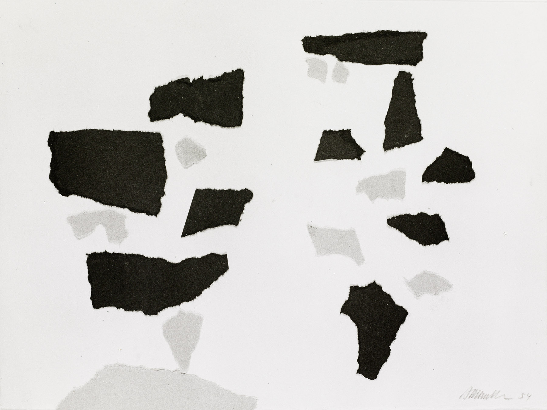 Collage mit schwarzem Fotokarton und grauem Ingres-Bütten, Ränder gerissen, auf chamoisfarbigem, am Rand u. im scharfen Knick abgetrenntem Zeichenkarton