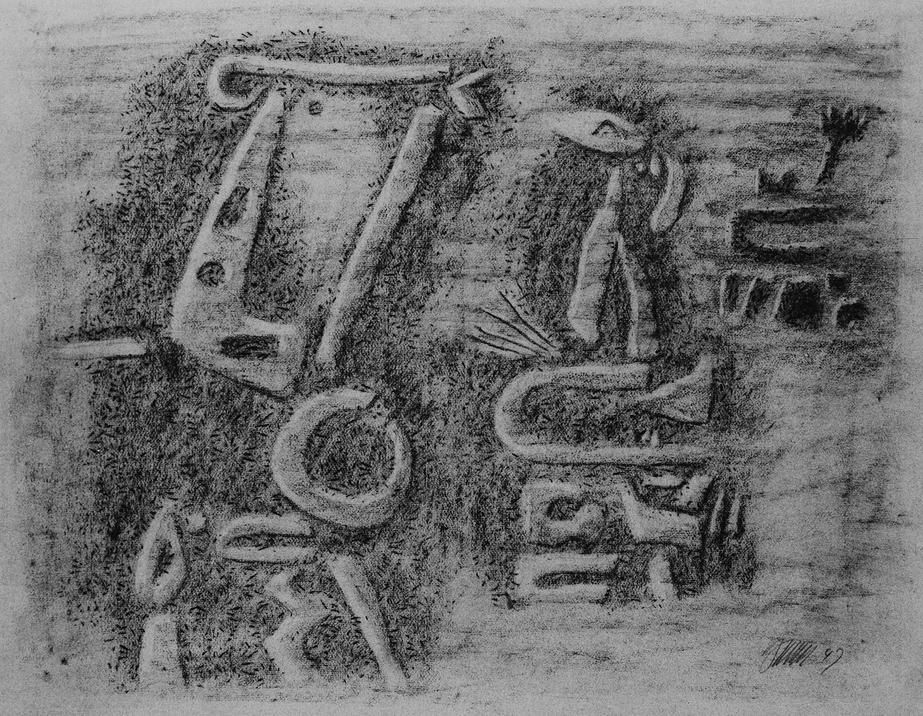 Kohle, gewischt, radiert, Ölkreide in Schwarz, durchgerieben, fixiert, auf rosafarbigem Ingres-Bütten mit Wz. l. o.: Ingres