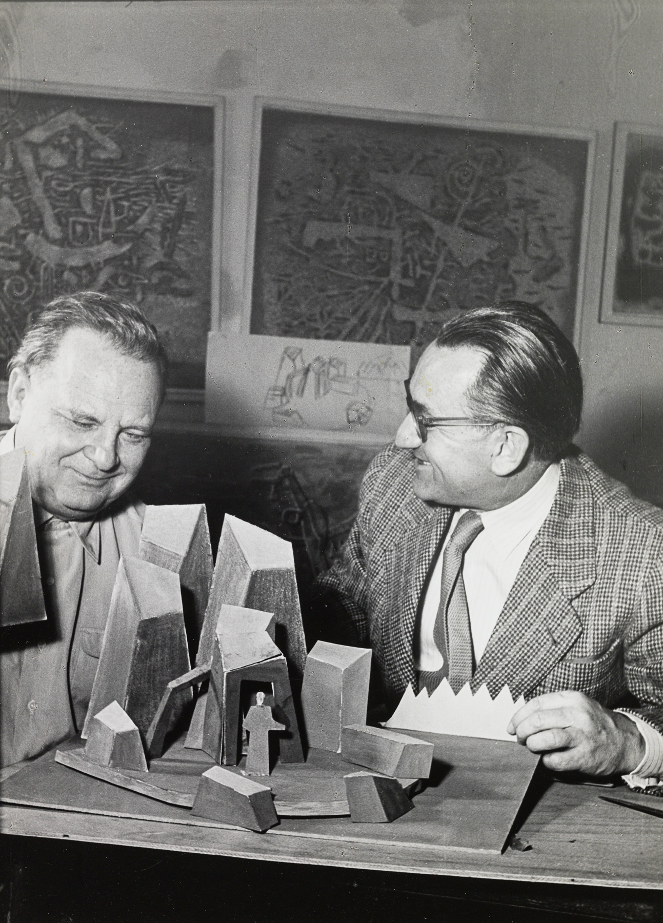 Der Schweizer Maler, Bildhauer, Architekt, Möbel- und Produktdesigner Max Bill (1908–1994) ist einer der wichtigsten Künstler der Konkreten Kunst. Er studierte 1927/28 in Dessau am Bauhaus und lehrte später an der Hochschule für Gestaltung in Ulm/Donau. Bill und Baumeister waren kollegial und freundschaftlich verbunden. Bei gegenseitigen Besuchen tauschten sie Arbeiten aus und entdeckten ihr beiderseitiges Interesse für Archäologie, insbesondere für Kykladen-Idole. Ende 1946 plante Bill in Zürich eine Ausstellung mit Baumeister und Oskar Schlemmer. Auf Veranlassung Baumeisters sandte Max Bill einige jener Bilder nach Mailand, die Baumeister 1937/38 zum Schutz vor den Nationalsozialisten in die Kunsthalle Basel gesandt hatte. Nach dem Kriegsende begann ein reger Briefwechsel, der gegenseitigen Rat und Hilfe in Bezug auf Ausstellungen und Veröffentlichungen umfasste.